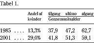 Tabel 1 viser andelen af kvinder samt gennemsnitsalder for alle nye læger, for alle læger ultimo året og for alle læger der ophører med at drive almen praksis for årene 1985 og 2001.