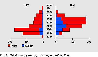 Lægepopulationens fordeling på køn og alder er illustreret i populationspyramiden (Fig. 1 ) for årene 1985 og 2001.