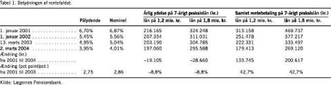 Renteniveauet har i en årrække været faldende, og opgørelsen i Tabel 1 viser, at det for køber har betydet en væsentlig reduktion i det beløb, der faktisk skal betales for at låne pengene i banken. Denne faktor har også medført, at det er blevet meget billigere at overtage en praksis. Konkret har rentefaldet betydet, at har man behov for at låne 1,8 mio. kr., vil renteudgiften over de syv år det tager at betale lånet tilbage, være blevet reduceret med over 200.000 kr. svarende til 42,7%2 i de sidste fire år. Markedet for praksiskøb virker således anderledes end f.eks. markedet for huse, hvor man ofte ser, at det er den samlede ydelse (renter og afdrag), der handles på, og hvor en lavere ydelse medfører en højere salgspris. I praksishandler afhænger prisen ikke direkte af renteniveauet, og pga. reglerne om goodwill har den lavere rente ikke medført en højere maksimal goodwill.