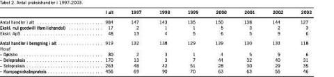 I 2003 er der gennemført 127 handler, det mindste antal siden 1997. Det fremgår af Tabel 2 , at der handles 125-150 praksis hvert år, og i hele perioden 1997-2003 er der registreret 984 handler. I den videre analyse er ikke medtaget handler med anpartsselskaber, da disse handler prissættes på en helt særlig måde. Det samme gælder handler, hvor der er tale om nul goodwill pga. familiehandler. Disse handler udgør mellem 5 og 15 hvert år. Andre handler til nul er medtaget - se herom senere.