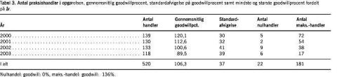 Det fremgår, at der i alt er handlet 22 praksis til 0 i goodwill (familiehandler undtaget), færre i begyndelsen og flere i slutningen af perioden. Endvidere er der handlet 181 praksis til maks. goodwill defineret til 136% og 241 defineret til 125% og derover. Nulhandler dækker i denne sammenhæng over forskellige situationer.