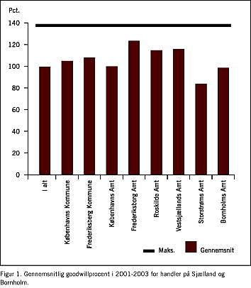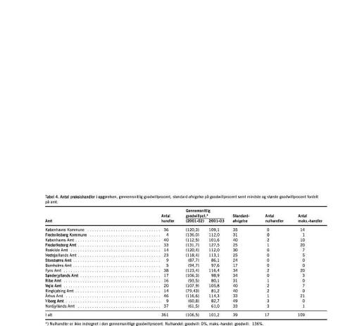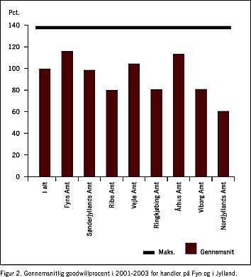 Der er et ret stabilt geografisk mønster over de sidste tre år. I Tabel 4 samt i Figur 1 og Figur 2 er udviklingen fordelt på amter. Sjælland holder fortsat et lidt højere gennemsnit end Jylland. Nogle af de højeste goodwillgennemsnit findes fortsat i amter med universitetsbyer, hvorfor Fyn også er godt med. Frederiksborg Amt ligger dog fortsat højest af alle.