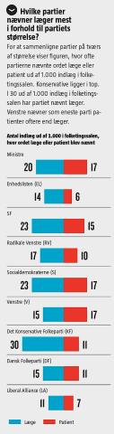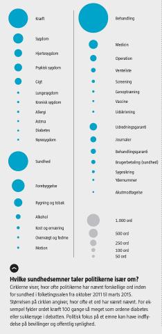 Ugeskrift for Læger har kortlagt, hvor mange gange de forskellige sundheds- og sygdomsområder - samt ordene "læger" og "patienter" - blev nævnt af de forskellige politiske partier i folketingssalen fra oktober 2011 til marts 2015. Ministre og de store partier taler naturligt mest, fordi de har mere taletid og flere folketingsmedlemmer.