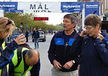 12.40 En engelsk løber har ondt i maven. Han har indtaget for meget powerbar undervejs. Han får noget vand og sidder lidt og sunder sig. Der kommer flere og flere trætte og dehydrerede løbere. De får sukker og vand, og vi prøver at indgyde dem mod. Mange ønsker tilbagetransport, men da byen er spærret af, er det svært at tilbyde. De fleste må gå de 4-5 km tilbage til målet.