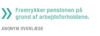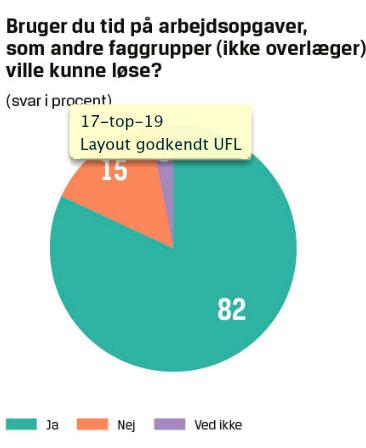 Det stigende arbejdspres kommer samtidig med, at otte ud af ti overlæger må udføre arbejdsopgaver, som andre arbejdsgrupper lige så godt kunne udføre. Og det er ikke bare et par minutter hist og pist. 60 procent peger på, at de bruger 10-25 procent af deres arbejdstid på opgaver, som andre faggrupper kunne løse. Det drejer sig især om arbejde, som lægesekretærer, sygeplejersker og yngre læger kan udføre.