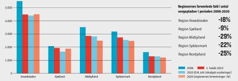 Allerede nu nærmer regionerne sig målet. Forrige år var der 13.296 somatiske sengepladser. Altså er 2.603 senge skåret væk siden 2006, og der mangler nu kun at blive reduceret 577 sengepladser frem til 2020, før anbefalingerne er nået. Region Midtjylland, Syddanmark og Nordjylland planlægger endda at skære endnu flere senge bort, end Erik Juhl Udvalget pegede på.