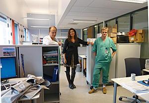 På den nye intensivafdeling på St. Olavs Hospital i Trondheim har alle patienter fået enestuer. Ved ombygningen fik læger kontorer tæt på afdelingen, men mange var henvist til nimandskontorer. Klinisk arbejde foretages på arbejdsstationer på afdelingen, men lægerne har alligevel klaget til ledelsen over urolige kontorforhold. Nu bliver kontorerne opdelt, så der højst sidder fire i hvert. På billedet ses afdelingsleder overlæge Pål Klepstad og overlæge Ole Kristian Rulfseng på et nimandskontor. I midten chefarkitekt Ragnhild Aslaksen.