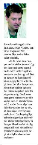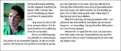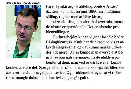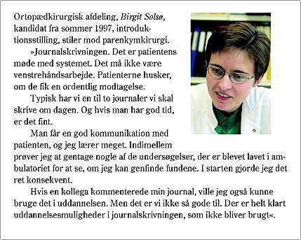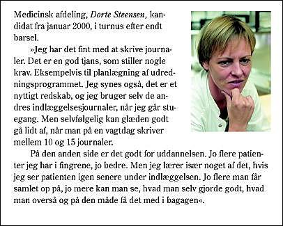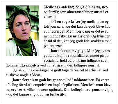 En helt almindelig efterårsmandag besøgte Ugeskriftet Silkeborg Centralsygehus for at høre, hvad de yngre læger synes om at skrive journaler. Udtryk som journalslave og rutinearbejde undslap de læger, vi talte med. Men også formuleringer om, at det er op til én selv, om man vil lære noget af journalarbejdet, at det er patientens første møde med systemet og derfor ikke må fremstå som rutinearbejde, og at det er et vigtigt arbejde, som kollegerne skal bruge i det videre forløb, var centrale i udtalelserne.