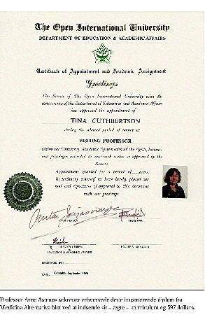 »I visse behandleres klinikker hænger diplomerne tæt på væggene og efterlader indtryk af, at behandleren ikke alene er læge, men videnskabsmand med stor produktion bag sig og hædersbevisninger fra alle mulige universiteter. Behandlerne optræder også med deres fine titler i diverse ugeblade. Hvis man ikke har særlige forudsætninger for at vurdere validiteten af diplomer og uddannelser, vil man da tro, at man har at gøre med en person, som har betydeligt finere faglig baggrund end ens egen praktiserende læge.