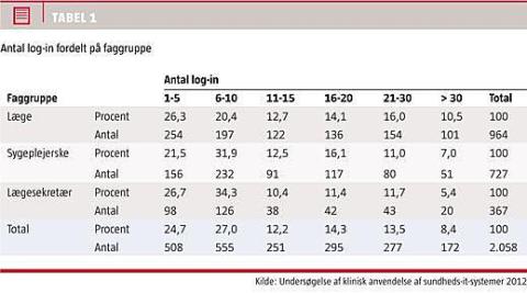 Interviewene afslører flere interessante detaljer om sundheds-it. Således viser den færdige rapport, at der er stor forskel på specialerne i log-in-tid. Nogle har mange og andre har ganske få. Flest log-in bruger de ansatte inden for specialerne onkologi, anæstesiologi og gynækologi/obstretrik. Hver tredje ansat på en onkologisk afdeling logger sig på mere end 20 gange om dagen. Lidt under hver tredje ansat på en gynækologisk/obstetrisk afdeling og en tredjedel på en anæstesiologisk afdeling skal ligeledes logge sig på mere end 20 gange om dagen.