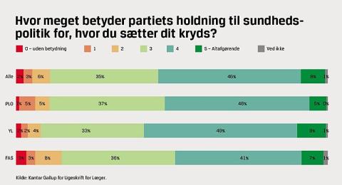 For de danske læger er sundhedspolitikken ikke helt overraskende det vigtigste område at beskæftige sig med for en kommende regering. Hele 80 procent af lægerne peger på sundhedsområdet som et af de tre vigtigste at beskæftige sig med i de kommende år, og for mere end halvdelen af lægerne har partiernes holdning til sundhedspolitik afgørende eller altafgørende betydning for, hvor de sætter deres kryds.