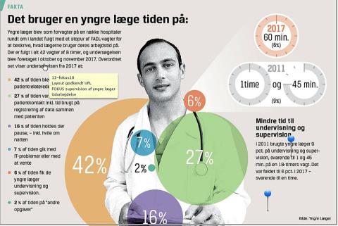 En ny undersøgelse af, hvad en yngre læge laver på en arbejdsdag, viser ellers, at andelen af supervision og undervisning i lægernes arbejdstid er faldet fra 9,1 pct. i 2011 til 6,2 pct. På en 18-timersvagt svarer det til et fald fra en time og 45 minutter til ca. en time.