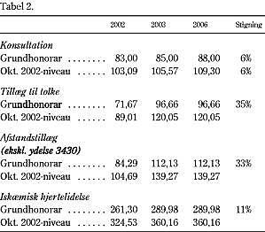 Der er i vidt omfang tale om større honorar for samme arbejde, svarende til ca. kr. 44.000 pr. år pr. læge. Stigningen er lagt på vores kerneydelse, konsultationen, og endvidere på tolketillæg, afstandstillæg og iskæmisk hjertelidelse. Stigningen i kendte honorarer fremgår af Tabel 2 .