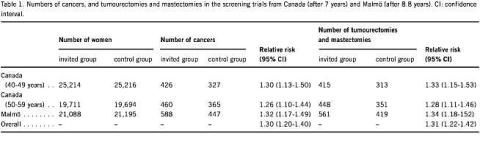 Man kan belyse omfanget af overdiagnostikken og overbehandlingen pålideligt i lodtrækningsforsøgene fra Canada og Malmø, som ikke var biased [2], og hvor man efter lang tids opfølgning endnu ikke var begyndt at screene kontrolgruppen. Som det fremgår af tabellen, var der i disse forsøg en 30% overdiagnostik af cancer [3, 4] hvilket svarer nøje til den kirurgiske overbehandling på 31%, som der tidligere er redegjort for [2]. De to kvinder, som pr. 1.000 screenede kvinder vil blive unødigt mastektomeret, kan beregnes ud fra tallene for mastektomierne [2].Se også Fig. 1 .
