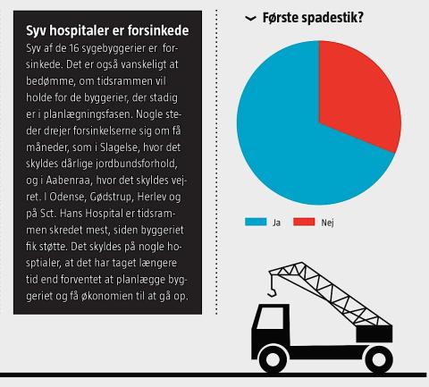 7 af de 16 sygebyggerier er forsinkede. Det er også vanskeligt at bedømme, om tidsrammen vil holde for de byggerier, der stadig er i planlægningsfasen. Nogle steder drejer forsinkelserne sig om få måneder, som i Slagelse skyldes dårlige jordbundsforhold og i Aabenraa vejret. I Odense, Gødstrup, Herlev og på Sct. Hans Hospital er tidsrammen skredet mest, siden byggeriet fik støtte. Det skyldes på nogle hosptialer, at det har taget længere tid end forventet at planlægge byggeriet og få økonomien til at gå op.