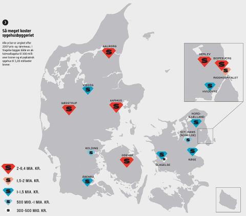 Et af danmarkshistoriens største byggerier er godt i gang: 5 helt nye supersygehuse og 11 ombygninger af eksisterende hospitaler, som bliverbetalt af statens kvalitetsfond og regionerne. Pris 41,4 mia. kroner. Derudover er regionerne i færd med 28 andre byggerier og istandsættelser på sygehusene til en værdi af over 11 mia. kroner. De største byggeprojekter er de nye universitetshospitaler i Aarhus og Odense, som hver især koster omkring 6,3 milliarder kroner, mens der er afsat rundt regnet 4 milliarder kroner til hospitalerne i Aalborg, Køge og Nordsjælland.