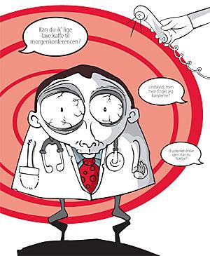 Men der er også meget andet at tage fat på. Ganske vist trives man godt på afdeling L, det er der enighed om lige fra basislægen, der kom her i sidste uge, til de gamle i gårde. Men der er alt for meget papirarbejde i forbindelse med uddannelsessamtaler. Og på morgenkonferencen ville det være godt, hvis den afgående forvagt kunne debriefe med den bagvagt, der møder ind kl. 8. Måske kunne den næste vagt møde lidt tidligere? I øvrigt burde man overveje, om det virkelig er smart, at det er den afgående forvagt, der skal lave kaffe til morgenkonferencen. Mange patienter har det med at blive dårlige ved syvtiden, og så har man ikke brug for en ekstra stressfaktor, bemærker en af de yngste læger.