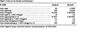 Denne mandag har forvagten, som er en dansk stud.med., indlagt 6 patienter, hvilket er lidt mere end vanligt for en mandag. »Er der nogen dårlige imellem«, spørger jeg. »Nej, ikke rigtigt i forhold til akut behandlingsindsats«, svarer Charlotte Runge Sørensen og tilføjer, »vi har ikke nogen videre ambulant virksomhed, hvorfor alle elektive udredningspatienter også regelret indlægges«. ITabel 1 ses, at Færøerne fysisk har flere senge pr. indbygger end Danmark til trods for færre læger pr. indbygger. En stor del af den danske produktion foregår i ambulante og dagho-spitalsforløb og andrager i år 2000 mere end 4,5 millioner outpatient-kontakter. Der findes ikke direkte sammenligningsgrundlag til Færøerne i de eksisterende tal, som kun beskriver »after care«-kontakter til knap 2.800 pr. år, og personligt oplevede jeg både et ugentligt diabetesambulatorium og et dermatologiambulatorium. Det ses, at skadestuefrekventeringen er meget lavere end i Danmark, men kan skyldes, at almen praksis tager sig af skader.