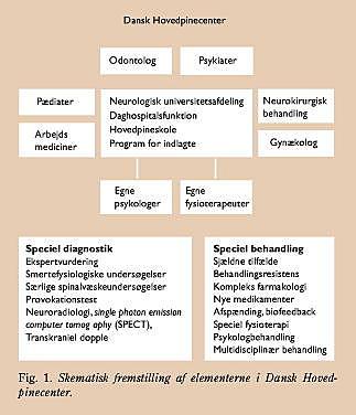 Det har været klart i mange år, at der er behov for mere specialiserede enheder til de sjældne eller svært behandlelige hovedpinepatienter. I Dansk Neurologisk Selskabs referenceprogram om hovedpine, som udkom i 1994, foreslog man da også oprettelse af en landsdelsfunktion på Amtssygehuset i Glostrup. I 2001 lykkedes det endelig at få etableret et sådant højt specialiseret center for hovedpinediagnostik og hovedpinebehandling, Dansk Hovedpinecenter, knyttet til den neurologiske universitetsafdeling ved Amtssygehuset i Glostrup. Oprettelsen skete på baggrund af 20 års hovedpineforskning i den internationale frontlinje, og centret har derfor kunnet bemandes med læger med langvarig forskningserfaring inden for hovedpinesygdommene. Centret har endvidere egne specialsygeplejersker, psykologer og fysioterapeuter. Centret har landsdelsfunktion, men fungerer også som basisafdeling for Københavns Amt. Patientindtaget i 2001 var 600 nye patienter, og fra og med 2003 har centret kapacitet til færdigbehandling af 1.000 nye patienter pr. år. Alle patienter ses først af en neurolog, og derefter kan de, afhængigt af deres problemer, gennemgå forskellige forløb som skitseres i Fig. 1 . Godt halvdelen af patienterne færdigbehandles rent lægeligt, mens knap halvdelen får fysioterapeut- eller psykologterapi eller indgår i en hovedpineskole, der forestås af en specialsygeplejerske. Hovedpineskolen tager sig af den overraskende store gruppe af patienter, der har et væsentligt medicinoverforbrug, der paradoksalt medvirker til at vedligeholde hovedpinen, den såkaldt medicinfremkaldte hovedpine. Centret var fra starten tænkt som udelukkende daghospitalsbaseret, men det har vist sig, at en række meget svære tilfælde kræver indlæggelse. I første omgang er der etableret to faste senge til hovedpinepatienter, men det står allerede nu klart, at kapaciteten er utilstrækkelig. Næste skridt bliver forhåbentlig udvidelse til seks hovedpinesenge med to forskellige patientforløb, et forløb for patienter, der indlægges til afvænning, og et andet forløb for patienter, der ikke har noget overforbrug, men som har brug for et intensivt observations- eller behandlingsforløb under indlæggelse. Etableringen af Dansk Hovedpinecenter som tredje led i behandlerpyramiden for hovedpinepatienter er efter Dansk Hovedpine Selskabs opfattelse et markant fremskridt i behandlingsmulighederne for patienter med meget svære og/eller sjældne hovedpinesygdomme i Danmark.