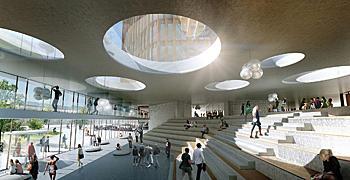 Det næste panum - Panum Instituttets dystre, vinduesløse fæstning med de skjulte indgangsdøre vil om få år være fortid. Et 16 etager højt »forskertårn« med græsplæne på toppen skal være omdrejningspunktet i et kompleks af lavere bygninger, der skal åbne sig mod byen udenfor. Et centralt »forskertorv« omkring hovedindgangen fra Blegdamsvej (billedet) bliver Panums nye samlingssted, og offentligheden vil få adgang til tårnet - som anes i skylightet - hvor der vil være café, lounge og udsigtspunkter. Rundt om komplekset skal der anlægges en bypark. Vinderprojektet i konkurrencen om udbygning af Panum-komplekset er udarbejdet af arkitektfirmaet C.F. Møller sammen med SLA og Rambøll (Grafik: C.F. Møller/Mir).