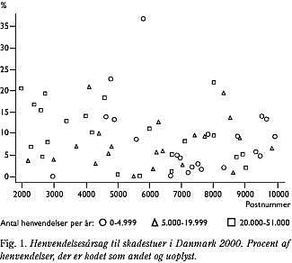De ca. 1 mio. henvendelser per år til landets skadestuer registreres efter Sundhedsstyrelsens bestemmelser (2). Styrelsens oversigter viser dog betydelige vanskeligheder med kompletheden af registrering. I Fig. 1 er vist andelen af henvendelser, der er kodet som »andet« eller »ukendt« i år 2000. Det er ikke tilfredsstillende, at så stor en andel er kodet uden årsag.