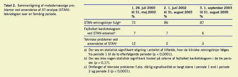 Frekvensen af falsk positive, defineret som en situation hvor STAN alarmerer, men barnet efterfølgende fødes med normal pH (navlearterie-pH > 7,15), var lav, men dog signifikant stigende fra periode 1 og periode 2 (4,23% og 4,91% henholdsvis) til periode 3 (7,6%) (p < 0,0001). Dette skyldes dog ikke så meget raten af falsk positive, men at raten af uoplyste tilfælde i periode 3 var ret stor. Vurderingen af disse data kompliceres således af, at der igennem observationsperioden er et stigende antal forløb, hvor der ikke foreligger arterie-pH-oplysninger, idet der enten kun er taget vene-pH eller slet ikke er foretaget pH-måling. I periode 1 foreligger der arterie-pH på stort set alle, i periode 2 og periode 3 mangler pH-data på henholdsvis 5% og 8%. Øvrige metodemæssige data fremgår af Tabel 2 .