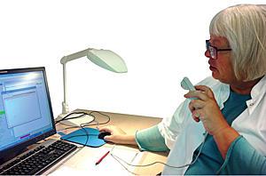 »Det er et meget støjfølsomt system. Sidder du i et lokale, hvor der snakkes, en taber en kuglepen på gulvet, eller en dør smækker, kommer der sjove tegn på skærmen«, siger
