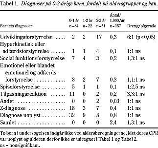 Over halvdelen af de henviste børn var under et år: 84 børn eller 54% var i aldersgruppen 0-1 år, og 51 børn eller 32% var i aldersgruppen 2-3 år. Udviklingsforstyrrelser forekom hos i alt 21 børn, heraf havde 20 diagnosen gennemgribende udviklingsforstyrrelse, som forekom hos 13% af samtlige henviste børn. Dette svarer til en kumuleret incidensproportion af gennemgribende udviklingsforstyrrelse på 0,5 0 /00 blandt 0-3-årige børn i Københavns Amt over en toårsperiode. Diagnosen gennemgribende udviklingsforstyrrelse forekom hyppigst hos de ældste børn, nemlig hos 35% af alle henviste 2-3-årige. Hyperkinetisk forstyrrelse og adfærdsforstyrrelse forekom hos seks børn, og blandede adfærdsmæssige og emotionelle forstyrrelser samt emotionelle forstyrrelser forekom hos i alt 17 børn. Disse diagnoser forekom ligeligt hos børn under og over to år. Z-diagnoser blev givet til 28 børn eller 18% af samtlige henviste børn, men var hyppigst for de yngste, nemlig 21% af de 0-1-årige. Den hyppigst anvendte Z-diagnose var »observation på mistanke om psykisk lidelse«. En stor del af de henviste børn havde ingen diagnose; dette gjaldt 31% af alle og 38% af børnene i aldersgruppen 0-1 år. For de 0-1-årige var det således hyppigst, at barnet ikke fik en selvstændig børnepsykiatrisk diagnose. I denne aldersgruppe forekom der tilpasningsforstyrrelse som hyppigste psykiatriske diagnose for 11 børn eller 13%. Spiseforstyrrelser forekom hos i alt syv børn, heraf var fem under et år. Tilsvarende fandtes en relativ overhyppighed af social funktionsforstyrrelse, herunder reaktiv tilknytningsforstyrrelse hos de yngste børn: af i alt 14 børn med denne diagnose var syv eller halvdelen med diagnosen under et år.