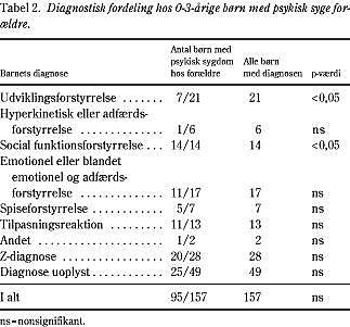 Resultater : I alt 159 børn blev henvist til børnepsykiatriske afdelinger over en toårig periode, hvilket svarer til en kumuleret incidensproportion på 0,4%. Samlet var dreng/pige-ratioen 1,3:1, men for gennemgribende udviklingsforstyrrelser dominerede drenge med ratioen 6:1. For spiseforstyrrelser var pige/dreng-ratioen 5:2 i den yngste aldersgruppe. Gennemgribende udviklingsforstyrrelse var den hyppigste diagnose blandt de 2-3-årige børn. Diagnosen forekom hos 20 børn, hvilket svarer til en incidensrate på 0,25 per 1.000 per år. Z-diagnoser var de hyppigste diagnoser for de yngste børn, som signifikant hyppigere havde psykisk syge forældre. Social funktionsforstyrrelse, spiseforstyrrelser og tilpasningsreaktioner var hyppige diagnoser hos børn med psykisk syge forældre, men mere end halvdelen havde ingen børnepsykiatrisk diagnose.