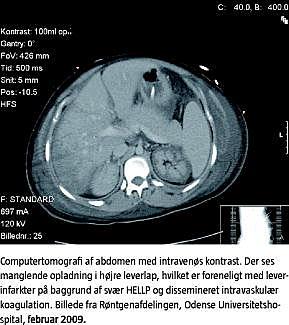 Der udkom svært påvirkede arterieblodgasværdier og blodprøver (se Tabel 1 ), bl.a. laktatacidose (ph 6,95, laktat 12 mmol/l), anæmi (5,5 mmol/l), laktatdehydrogenase (> 2.500 E/l) og trombocytopeni (8 × 10E9). Endvidere var der svært påvirkede hæmostasetal med lave koagulatiosfaktorer II, VII, X (0,13) og antitrombin (0,15) samt fibrin d-dimer (> 100) og blødningstid (> 200 sekunder). Patienten havde HELLP kompliceret med DIC, og hun blev overført til intensiv afdeling. Her blev patienten behandlet symptomatisk i respirator og substitueret med blod- og koagulationskomponenter (erytrocytter, plasma, trombocytter og antitrombin 3).