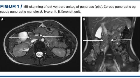 En 18-årig kvinde, som havde fået diagnosticeret Aspergers syndrom, fik over en måned mavesmerter, kvalme, opkastninger, nedsat fødeindtag og vægttab. Hun blev via egen læge henvist til ultralydskanning af abdomen. Ved skanningen blev der påvist bilaterale nyrecyster og rejst mistanke om atrofi af pancreas, da caput pancreatis – men hverken corpus pancreatis eller cauda pancreatis (Figur 1) – kunne ses. Der blev foretaget en gastroskopi og taget biopsier fra duodenum, hvor der blev fundet upåfaldende forhold. Ved en MR-skanning af pancreas påvistes agenesi af det dorsale pancreasanlæg. Størstedelen af symptomerne aftog spontant. På mistanke om pancreassygdom blev patienten henvist til videre ambulant udredning på et universitetshospital. Fraset Aspergers syndrom var patienten tidligere sund og rask. Hun klagede fortsat over mavesmerter, som var lokaliseret under venstre ribbenskurvatur og forværredes postprandialt. Vægttabet var aftaget, og hun havde taget på igen. Der forelå blodprøver, som viste, at hun havde et lavt D-vitamin-niveau (20 nmol/l) og et normalt niveau af glykeret hæmoglobin (41 mmol/mol). En supplerende udredning viste normal faeceselastase (210 µg/g), hvorfor man ikke havde mistanke om pancreasinsufficiens. Derimod blev der påvist hypomagnesiæmi med et magnesiumniveau på 0,64 mmol/l. Pga. hypomagnesiæmien blev patienten undersøgt genetisk for Gitelmans og Bartters syndrom. Disse undersøgelser viste normale forhold. En døgnurinopsamling viste, at der var et renalt betinget magnesiumtab. Der blev foretaget behandling med infusion af magnesium, uden at P-magnesiumniveauet steg nævneværdigt. Der blev påbegyndt behandling med spironolacton mhp. at forebygge dette renale tab.