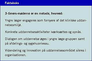 3-timers-møderne er på sjette år med til at sætte postgraduat uddannelse på dagsordenen på Aalborg Sygehus. Møderne giver yngre læger (YL) tre timer i arbejdstiden til afdelingsvis at diskutere postgraduat uddannelse og uddannelsesmiljø med innovativt formål. Metoden kan kaldes for en moderne tænketank, hvor YL på formaliseret vis engageres og gives mulighed for at blive hørt hos afdelings- og sygehusledelsen [1]. Det primære fokus er, hvilke uddannelsestiltag YL selv kan iværksætte, men også hvad øvrige kolleger, afdelingen og sygehuset kan bidrage med. De gode ideer følges derfor op af dialog og handling i hele organisationen. Metoden giver konkrete resultater for alle parter. YL får ved deres engagement en stor del af deres forslag iværksat. Afdelingsledelserne får konkret viden, som bruges til prioritering af uddannelsestiltag i afdelingen. Organisationens perspektiv er, at »uddannelsestemperaturen« bestemmes, og indsatsområder klarlægges, mens videndeling sikres, og visionen for det fremtidige uddannelsesmiljø formidles.