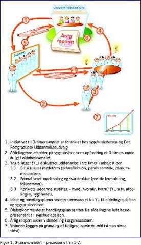 1+2) 3-timers-møderne blev initieret af sygeledelsen og Det Postgraduate Uddannelsesudvalg (DPU) i 2002, og de afholdes årligt i de enkelte afdelinger (29-31 afdelinger) i oktoberkvartalet. Sygehusets uddannelseskoordinerende overlæge (SUKO) sikrer udvikling og afvikling af møderne, håndtering af indberetningerne og afrapportering. Mødeprogram, indberetningsskemaer og 3-timers-rapporter for perioden 2002-2006 er tilgængelige elektronisk [3]. Processen evalueres årligt i DPU.