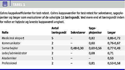 Fra de seks afdelinger ønskede i alt 42 ud af 44 mulige turnuskandidater at deltage i undersøgelsen. Af disse var der 23 kvindelige og 19 mandlige turnuskandidater. Antallet af deltagere fra hver afdeling varierede fra 5-11. Som evaluatorer deltog i alt 16 sekretærer, 94 sygeplejersker og 85 speciallæger. Det tog gennemsnitligt 14,5 minutter (median) at udfylde evalueringsskemaet. Vi definerede de læringsmål, der kunne evalueres af henholdsvis sekretærer, sygeplejersker og læger ud fra antallet af krydser i boksen »kan ikke bedømmes«. Der er blevet brugt en arbitrær grænse på 80% af evaluatorer, som skulle kunne foretage en bedømmelse af det enkelte læringsmål i henhold til skalaen. Dette kriterium blev opfyldt for 15 af de udvalgte 22 læringsmål. Sekretærerne kunne evaluere to, sygeplejerskerne kunne evaluere syv, og speciallægerne kunne evaluere 14 af de 15 »evaluerbare« læringsmål. Kappaværdier for test og retest for de 15 læringsmål vises i Tabel 1 . Den interne reliabilitet af bedømmelserne vises i Tabel 2 . Den højeste værdi blev opnået for »medicinsk ekspert«. Diskriminationen af metoden var god med signifikant variation mellem turnuskandidaterne (p < 0,05).