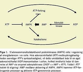 Det er af fundamental vigtighed for levende celler at kunne opretholde en høj adenosintrifosfat (ATP): adenosindifosfat (ADP)-ratio. Ligevægtskoefficienten for ATP:ADP er omkring 10-7 :1 under de intracellulære betingelser, der findes i de fleste celler, men levende celler opretholder faktisk en ratio på ca. 10:1, hvilket således er en faktor 108 fra ligevægt. Denne uligevægtssituation kan sammenlignes med forholdene i et fuldt opladet batteri, og kan som i batteriet bruges til at drive energikrævende processer. I celler oplades »batteriet« gennem kataboliske processer, som resulterer i omdannelse af ADP og fosfat til ATP, hvilket i overvejende grad foregår aerobt i mitokondrierne. Omvendt forbruger de fleste andre cellulære processer ATP, som konverteres til ADP (afladning af »batteriet« under f.eks. proteinsyntese, membranpumpeaktivitet, kontraktil aktivitet), som igen via adenylatkinasereaktionen (2ADP ↔ ATP + AMP) kan videreomdannes til AMP (Figur 1 ). Adenylatkinasereaktionen er den væsentligste årsag til, at systemet faktisk ikke monitorerer ADP-koncentrationen, men snarere AMP-koncentrationen, idet adenylatkinasereaktionen medfører, at AMP: ATP-ratioen varierer som kvadratet af ADP: ATP-ratio og således er meget mere følsom end ADP: ATP-ratioen. Det forekommer indlysende, at der må eksisterer kontrolsystemer, der afpasser de ATP-genererende processers hastighed til hastigheden, hvormed ATP forbruges, og det er derfor overraskende, at det system, der i væsentlig grad regulerer denne balance, nemlig 5'ade-nosinmonofosfataktiveret proteinkinase (AMPK) først er blevet kendt inden for de seneste godt ti år. Det er i løbet af de seneste år også blevet klart, at AMPK tilsyneladende spiller en vigtig rolle i reguleringen af kroppens metabolisme og i reguleringen af appetitten, hvorfor dysregulering af AMPK har været foreslået at være medvirkende til udvikling af fedme, det metaboliske syndrom og type 2-diabetes. Endvidere kendes der sygdomme, som skyldes mutationer i AMPK-genet, og som bl.a. kan lede til hjertesygdomme og glykogenophobning.