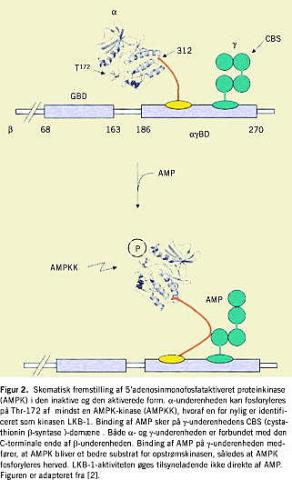 AMPK er en trimer bestående af en katalytisk α -underenhed og to regulatoriske underenheder benævnt henholdsvis β og γ (Figur 2 ). Der findes flere isoformer af hver underenhed: α1 og α2, β1 og β2 samt γ1, γ2 og γ3, som alle kodes fra forskellige gener. Aktivering af AMPK kan ske på flere måder. En måde er ved at AMP bindes til γ-underenheden, hvorved den katalytiske aktivitet øges op til ti gange [3]. ATP hæmmer til gengæld den katalytiske aktivitet af AMPK, hvorfor det i virkeligheden er ratio mellem AMP og ATP, der er af regulerende betydning for aktiviteten. Mere potent aktivering kan dog opnås ved fosforylering af α-underenheden af en opstrømskinase, som kan øge aktiviteten mere end 100 gange [1]. I det seneste år er (d)en opstrømskinase blevet identificeret som en allerede kendt kinase LKB-1 [4]. LKB-1 er en kendt tumorsupressor, og inaktivering af LKB-1 hænger sammen med udvikling af Peutz-Jeghers syndrom [5]. Interessant er det, at AMPK bliver et langt bedre substrat for LKB-1, når AMP bindes til AMPK. Herved får AMP altså en dobbeltstimulerende funktion på AMPK-aktiviteten (Figur 2). AMPK aktiveres også af kreatin og hæmmes af kreatinfosfat, hvorfor AMPK altså også er følsom for ændringer i ratioen mellem kreatin og kreatinfosfat [6]. Kreatinfosfat (CrP) virker som et akut energireservoir i muskelen (CrP+ADP ↔ Cr+ATP) og kreatin:kreatinfosfatratio stiger også, når cellens energistatus er truet. Det er desuden for nylig blevet vist, at AMPK også er følsom for en anden censor af cellens metaboliske status, nemlig cellens redoxpotentiale udtrykt ved nikotinamid-adenin-dinukleotid/reduceret nikotinamid-adenin-dinukleotid-ratio [7].