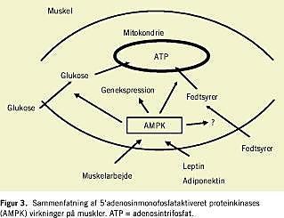 Aktivering af AMPK leder til fosforylering og dermed in-hibering af enzymet acetylCoA carboxylase (ACC). ACC katalyserer omdannelsen af acetylCoA til malonylCoA. MalonylCoA er det første trin i fedtsyresyntesen i væv, der kan syntetisere fedtsyrer de novo, men malonylCoA har også den vigtige egenskab at hæmme enzymet carnitin-palmitoyl-transferase 1 (CPT1). CPT1 er nødvendig for transporten af langkædede fedtsyrer ind i mitokondrierne, hvor fedtsyrerne nedbrydes og forbrændes til energi. Aktivering af AMPK medfører endvidere aktivering af enzymet malonylCoAdecarboxylase (MDC), som nedbryder malonylCoA. Aktivering af AMPK resulterer således via to mekanismer i en nedsættelse af koncentrationen af malonylCoA, hvilket medfører en nedsat inhibition af CPT1, hvilket igen skaber mulighed for øget transport og forbrænding af langkædede fedtsyrer i mitokondrierne. Der er endvidere forsøg, der tyder på, at aktivering af AMPK øger antallet af fedtsyretransportører i cellemembranen og øger dermed muligheden for optagelse af fedtsyrer ind i muskelcellerne (Figur 3 ). Farmakologisk aktivering af AMPK i skeletmuskler har endvidere vist en