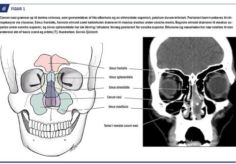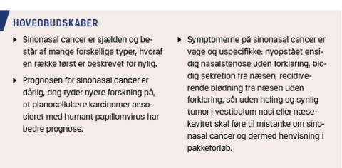 Sinonasal cancer er sjælden og udgør mindre end 1% af alle maligne tumorer, svarende til 3-5% af hoved-hals-cancerne [1]. Fjernmetastasering til næse- og bihuler er usædvanligt og udgår da hovedsageligt fra renalcellekarcinomer eller kolorektal cancer [2]. Sinonasal cancer giver som regel vage og uspecifikke symptomer, og diagnosen stilles derfor ofte sent i forløbet, hvilket også afspejles i en dårlig prognose [3, 4]. I Danmark diagnosticeres der ca. 60 nye sinonasale cancere pr. år [5]. Karcinomer udgør mere end 80% af de sinonasale cancere og diagnosticeres typisk blandt ældre og hyppigere blandt mænd end kvinder [6-11]. Mukøse maligne melanomer udgør en væsentlig del af de ikkeepiteliale cancere [9]. Vestibulum nasi-cancer indgår ikke i denne artikel.