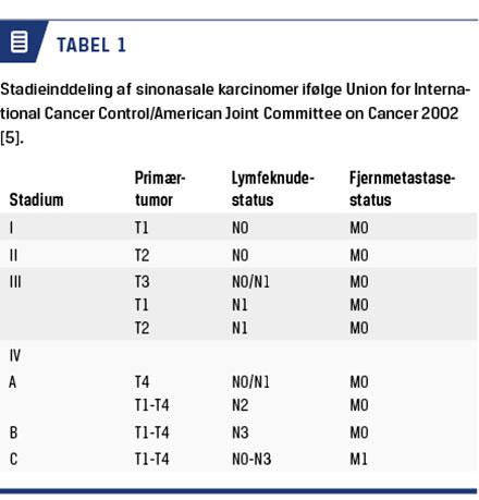 ca. 1/100.000. Der er geografisk variation med højeste incidens i afrikanske og asiatiske populationer (ca. 2,5/100.000) [4]. Cancerne er hyppigst lokaliseret i cavum nasi, sinus maxillaris og sinus etmoidalis. Cancer, der primært udgår fra sinus sphenoidalis og sinus frontalis er yderst sjælden (Figur 1). Det kan være vanskeligt at identificere udspringet med sikkerhed, da sygdommen ofte diagnosticeres i et lokalt avanceret stadium [7, 8]. Sinonasale karcinomer stadieinddeles iht. TNM-klassifikationen (Tabel 1) [8].