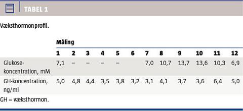 I 2012 blev der på gynækologisk afdeling rejst mistanke om akromegali, og patienten blev henvist til en endokrinologisk specialafdeling, hvor diagnosen blev bekræftet på basis af forhøjet IGF-1: 791 mikrogram/l (normalværdi 50-180 mikrogram/l) og forhøjet nadirvæksthormon: 3,6 mikrogram/l (under glukosebelastning) (Tabel 1) med et »stift mønster«. Behandlingen blev suppleret med somatostatinanalog, og efterfølgende kirurgisk adenomfjernelse overvejedes.