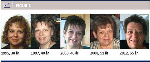 Der blev iværksat behandling med en dopaminagonist, hvorefter symptomerne bedredes, og S-prolaktinniveauet normaliseredes. Patienten forsatte i et ambulant forløb og fik gradvist vækstfænomener og symptomer, som er karakteristiske for akromegali: breddevækst af hænder og fødder, forgrovede ansigtstræk med frontal bossing samt vækst af næse, læber, tunge og kæber med øget diastema (Figur 1). Patienten gennemgik tre operationer for karpaltunnelsyndrom i 2004, 2010 og 2011; samtidig tiltog hovedpinen og ledsmerterne, hvilket i 2012 resulterede i langtidssygemelding.