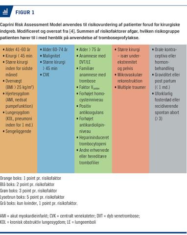 Forud for kirurgiske indgreb bliver patienterne risikovurderet med henblik på anvendelse af tromboseprofylakse. Caprini Risk Assessment Model (Figur 1) er et velkendt værktøj til vurdering af behov for tromboseprofylakse og varigheden af denne [4]. Afhængigt af summen af risikofaktorer inddeles patienterne i tre grupper: 1) 0-4 point: lav risiko, ingen profylaktisk behandling. 2) 5-7 point: moderat risiko, mekanisk og farmakologisk profylakse indtil genvundet mobilitet. 3) > 7 point: høj risiko, mekanisk og farmakologisk profylakse indtil fire uger efter udskrivelse. Der er evidens for effekten af tromboseprofylakse hos patienter med moderat og høj risiko [6].