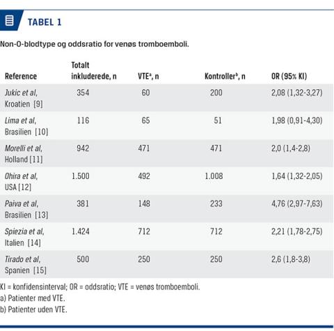 Resultaterne af et stadigt stigende antal studier indikerer, at patienter med blodtype non-0, dvs. A, B og AB, kan have en større risiko for at få VTE end patienter med blodtype 0 [9-17]. På det seneste har man i flere case-kontrol- og kohortestudier undersøgt blodtypen og risikoen for udvikling af VTE [9-15]. I studierne har man inkluderet alle tilfælde af VTE, uanset udløsende årsag, og man har derfor ikke udelukkende fokuseret på VTE, der er opstået som følge af kirurgi. Det er derfor ikke muligt at vurdere, om det er blodtype, kirurgi eller en helt tredje årsag, der resulterer i en øget risiko for VTE. Resultaterne indikerer, at patienter med non-0-blodtype synes at have en let øget risiko for at få VTE end patienter med blodtype 0 (Tabel 1). I alle de inkluderede studier har man angivet en diskret øget odds ratio (OR) for non-0-blodtyper end for blodtype 0 [9-20]. Det er dog svært at vurdere, hvilke forholdsregler der skal tages ved kirurgi, da man i studierne har inkluderet alle tilfælde af VTE og ikke udelukkende tilfælde som følge af kirurgi.