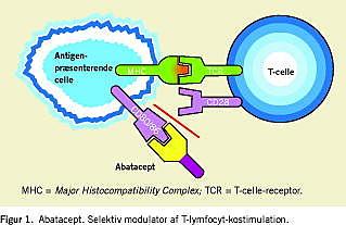Abatacept er et opløseligt fusionsprotein, der består af humant cytotoksisk lymfocyt-associeret antigen 4 (CTLA4), der er bundet til den modificerede fixed combination (Fc)-del af IgG1. Abatacept virker som selektiv kostimulationsmodulator ved at binde sig til CD80/CD86 på den antigenpræsenterende celle. Derved blokeres T-cellens interaktion med CD28, og aktiveringen af T-cellen hæmmes (Figur 1 ).