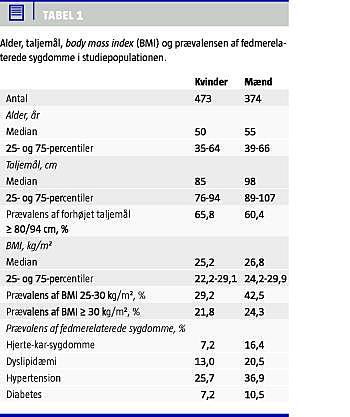 Forekomsten af overvægt og fedme blandt danskere er velbeskrevet, men der foreligger kun få studier, der beskriver forekomsten af abdominal fedme blandt danskere. Ifølge International Diabetes Federations (IDF's) kriterier for det metaboliske syndrom er taljemålet forhøjet, såfremt man som kvinde har et taljeomfang på over 80 cm og som mand på over 94 cm [10]. Thulstrup et al rapporterede i 1999, at taljemålet blandt 903 tilfældigt udvalgte indbyggere i Ebeltoft Kommune i alderen 30-50 år var 75 cm for kvinder og 92 cm for mænd (medianværdier) [11]. I et andet studie, i hvilket man undersøgte 27.178 kvinder og 29.875 mænd i alderen 50-64 år i perioden 1993-1997, var de mediane taljemål 80 cm hos kvinder og 95 cm hos mænd [12] - dvs. mere end halvdelen af de undersøgte havde forhøjet taljemål. De to epidemiologiske studier har taget udgangspunkt i den danske normalbefolkning, og resultaterne tyder på, at der allerede for ti år siden var en relativ høj prævalens af abdominal fedme blandt danske indbyggere.