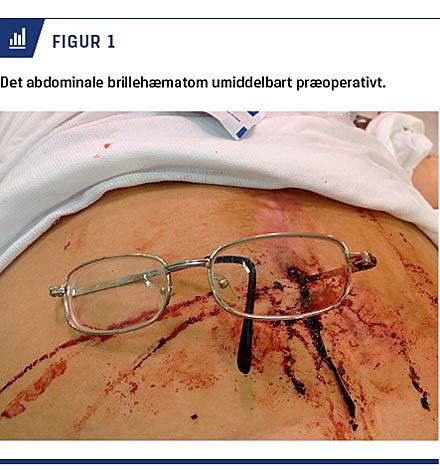 følgende blev hun anbragt i detentionen, hvor hun i afmagt gennemborede huden på abdomen ved umbilicus med venstre stang på et par aluminiumsbriller (Figur 1). Hun var ved ankomsten til hospitalet hæmodynamisk stabil. Pga. brillestangens lille diameter vurderede man, at der ikke kunne laves tilfredsstillende lokal såreksploration, da stikkanalen var for lille til at kunne