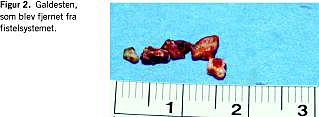 Et år efter vor operation fik patienten recidiv af infektion. En ny CT viste en fistel i bugvæggen. Fistlen mundede ud i et område med konkrementer nær højre leverlap (Figur 1). Ved reoperationen blev der udført laparotomi og excision af galdesten og fistelsystem gående mod højre leverlap (Figur 2). Ved klinisk kontrol og CT efter syv måneder var der ingen tegn på infektion eller efterladte galdesten i området.