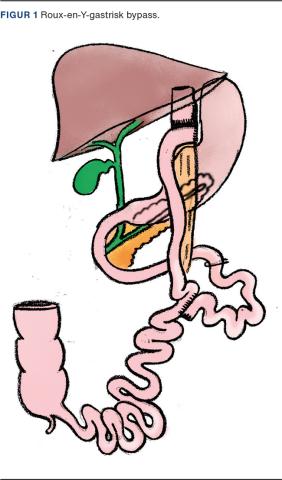 GBY udgør ca. 45% af alle fedmeoperationer i Danmark. Standardoperationen udføres ved dannelsen af en 20-30 ml ventrikelpouch med staplerteknik, hvorefter jejunum udmåles 70-75 cm fra Treitz’ ligament og trækkes op til den nydannede ventrikel antekolisk. Der udføres her en gastrojejunostomi med lineær stapler, der lukkes med resorberbar sutur. Der udmåles 120-150 cm jejunum fra gastrojejunostomien og udføres en entero-entero-anastomose med den tilførende slynge, hvorefter den tilførende slynge deles tæt på gastrojejunostomien med lineær stapler (Figur 1). For at forebygge intern herniering (IH) lukkes defekterne i tyndtarmskrøset med clips eller ikkeresorberbar sutur [4].