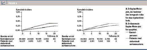 Hvis man ekskluderer patienter, der har haft tidligere events, var den årlige incidens for AMI 2,0% og for apopleksi 2,5% blandt de 11.083 opererede patienter. Tilsvarende var den årlige incidens for AMI og apopleksi i kontrolgruppen henholdsvis 0,9% og 1,9%. Hazard-ratioen for AMI var 2,2 (95% konfidens-interval (KI): 2,1-2,4) og for apopleksi 2,0 (95% KI: 1,8-2,1) (Figur 1). For patienter med AAA var de beregnede risici uafhængige af køn, modsat baggrundsbefolkningen, hvor der var en lavere risiko for apopleksi hos kvinder end hos mænd.