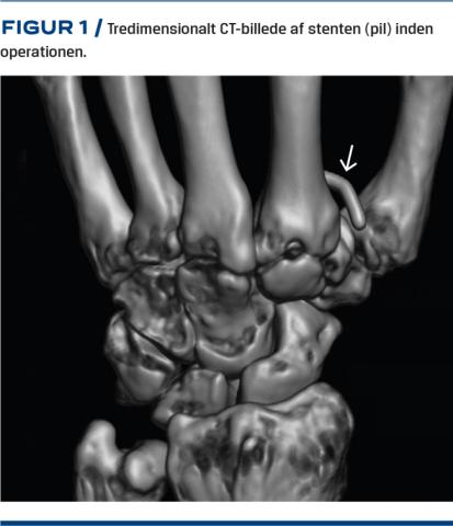 Ca. fire måneder efter tabet af stenten blev patienten vurderet i ortopædkirurgisk regi. Her udførte man røntgenoptagelser og CT mhp. visualisering af stenten og beslutning om, hvilken operationsteknik der skulle benyttes. Stenten blev visualiseret og var beliggende i arcus palmaris svarende til første interstits (Figur 1).